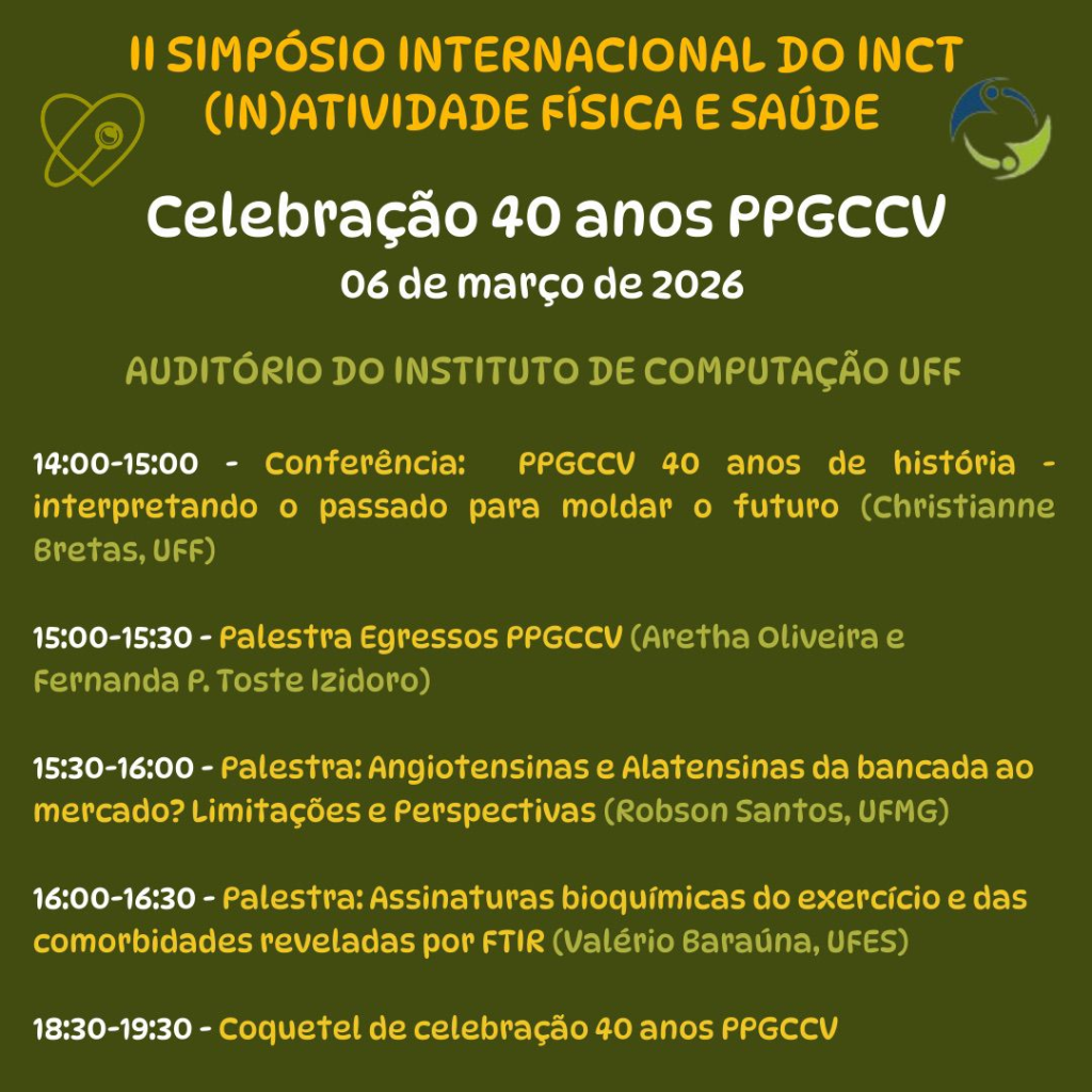 Por fim, o PPGCCV convida a comunidade acadêmica para a celebração dos 40 anos do Programa, que ocorrerá nos dias 06, 07 e 08 de março de 2026, durante a realização da XIII Jornada Anual em Ciências Cardiovasculares, em conjunto com o II Simpósio Internacional do Instituto Nacional de Ciência e Tecnologia (In)atividade Física e Saúde.